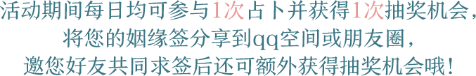 预约及参与运势占卜用户可获得1次抽奖机会,每成功邀请1位好友来预约可获得1次抽奖机会。每日最多能通过邀请好友获得5次抽奖机会。